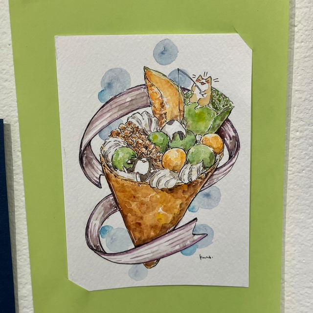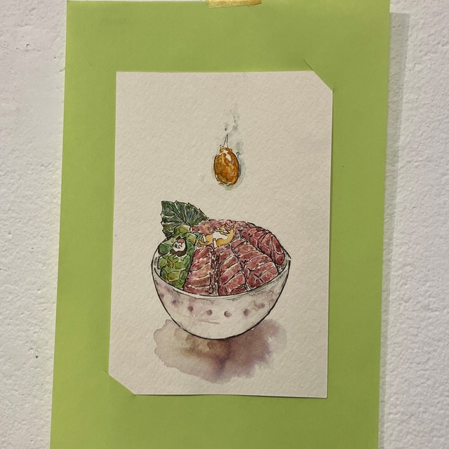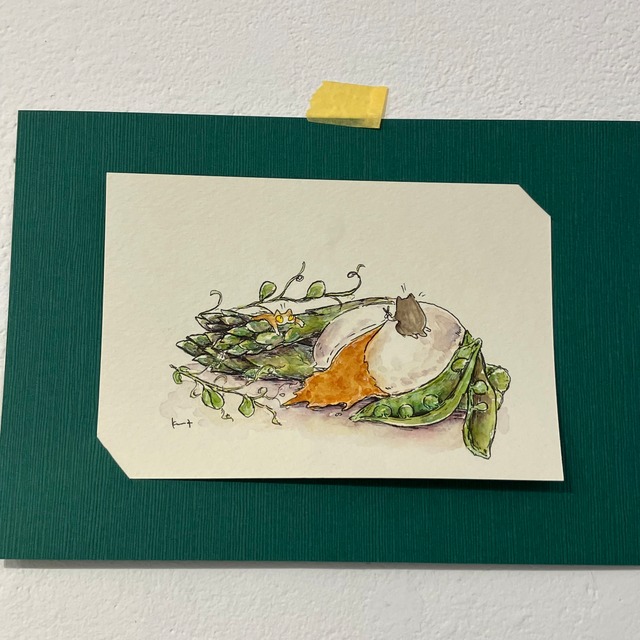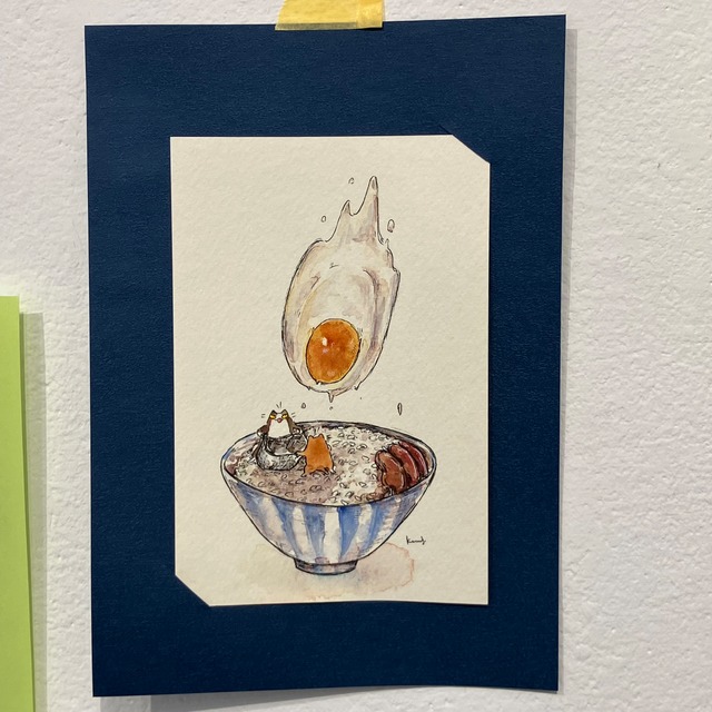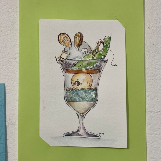 台紙:A5サイズ 原画:ハガキサイズ 紙:ホワイトワトソン 画材:ペン、透明水彩、ボールペン