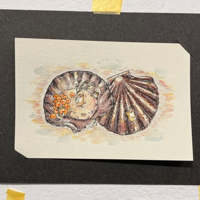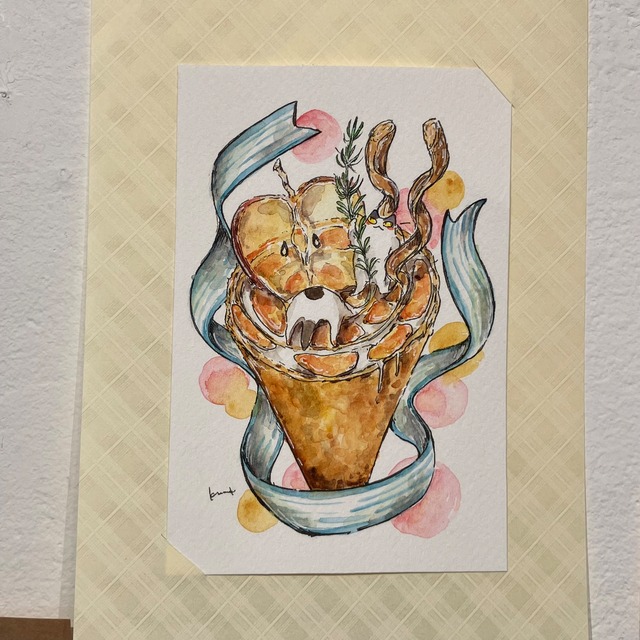 台紙:A5サイズ 原画:ハガキサイズ 紙:ホワイトワトソン 画材:ペン、透明水彩、ボールペン、インク