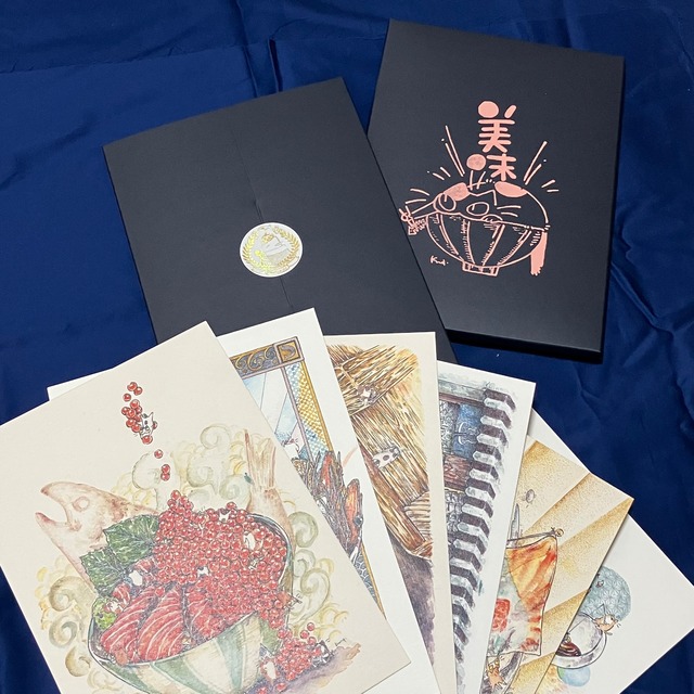 厳選したイラストを印刷したA5サイズのカードを6枚入れました。 シルクスクリーン印刷で手刷りした紙のケース付き。 中身は全て同じ、ケースのインク色のみ違いがあります。 画像3枚目左上から、ピンク、赤、ライトグレー、ゴールド、水色。 手刷りのため印刷のムラがあることはご容赦くださいませ。