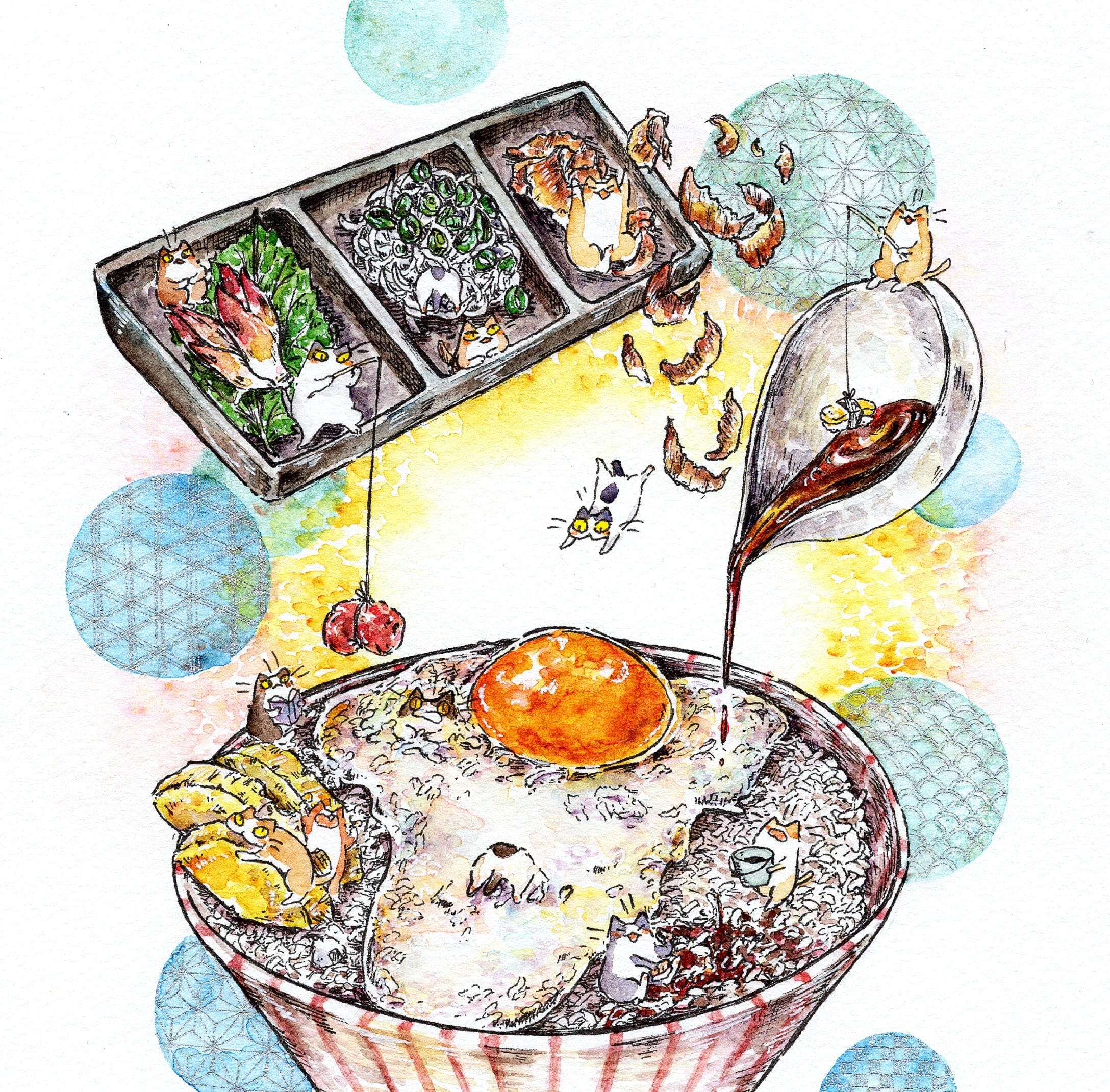 個展のメインビジュアルに合わせた鮭たまごご飯のアクリルキーホルダー。 お箸のチャーム付き。 本体を強く引っ張ると金具が変形する可能性がありますのでご注意下さい。