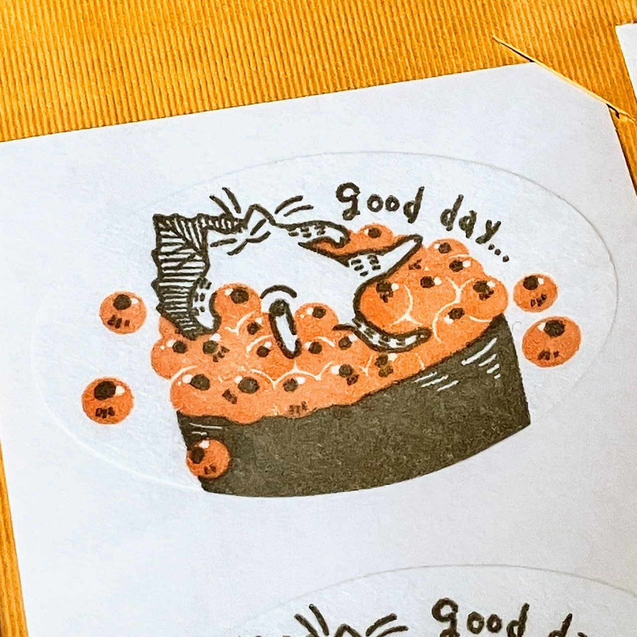 和紙×活版2色印刷のシール。 サーモン、いくら、たまご、各2枚入り。 横40mm×縦25mm。 印刷の特性上、版ズレしている箇所もある可能性があります。