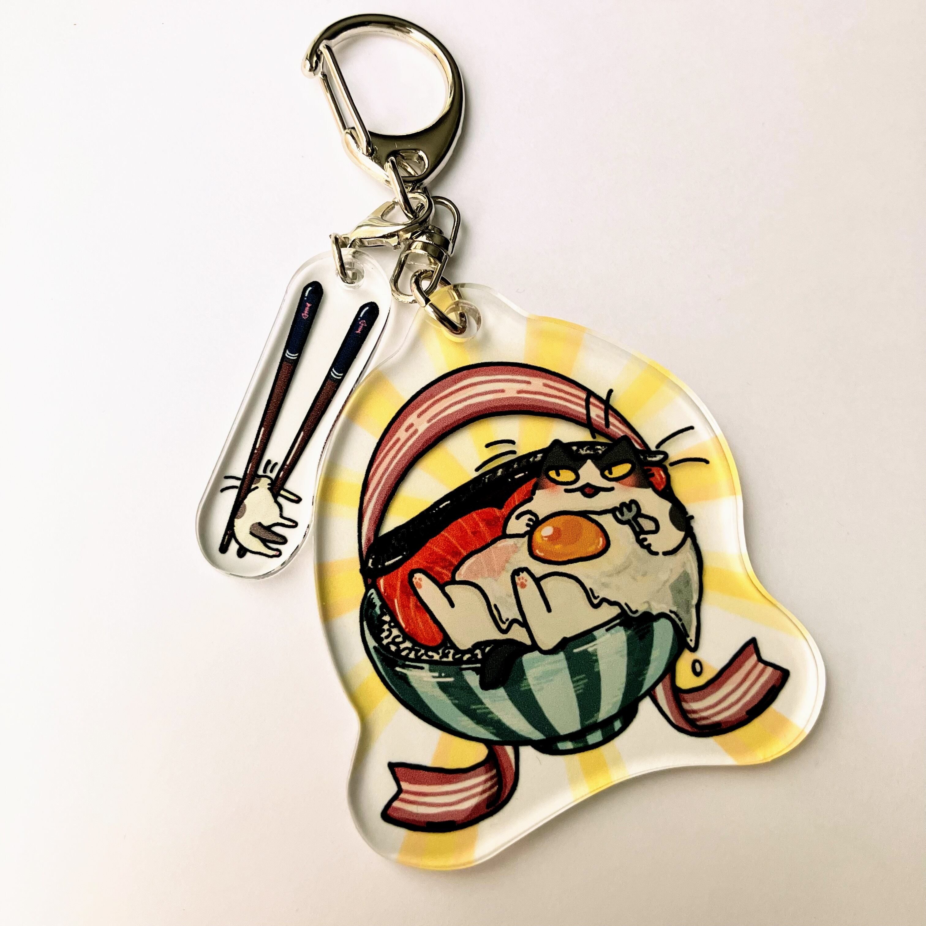 個展のメインビジュアルに合わせた鮭たまごご飯のアクリルキーホルダー。
