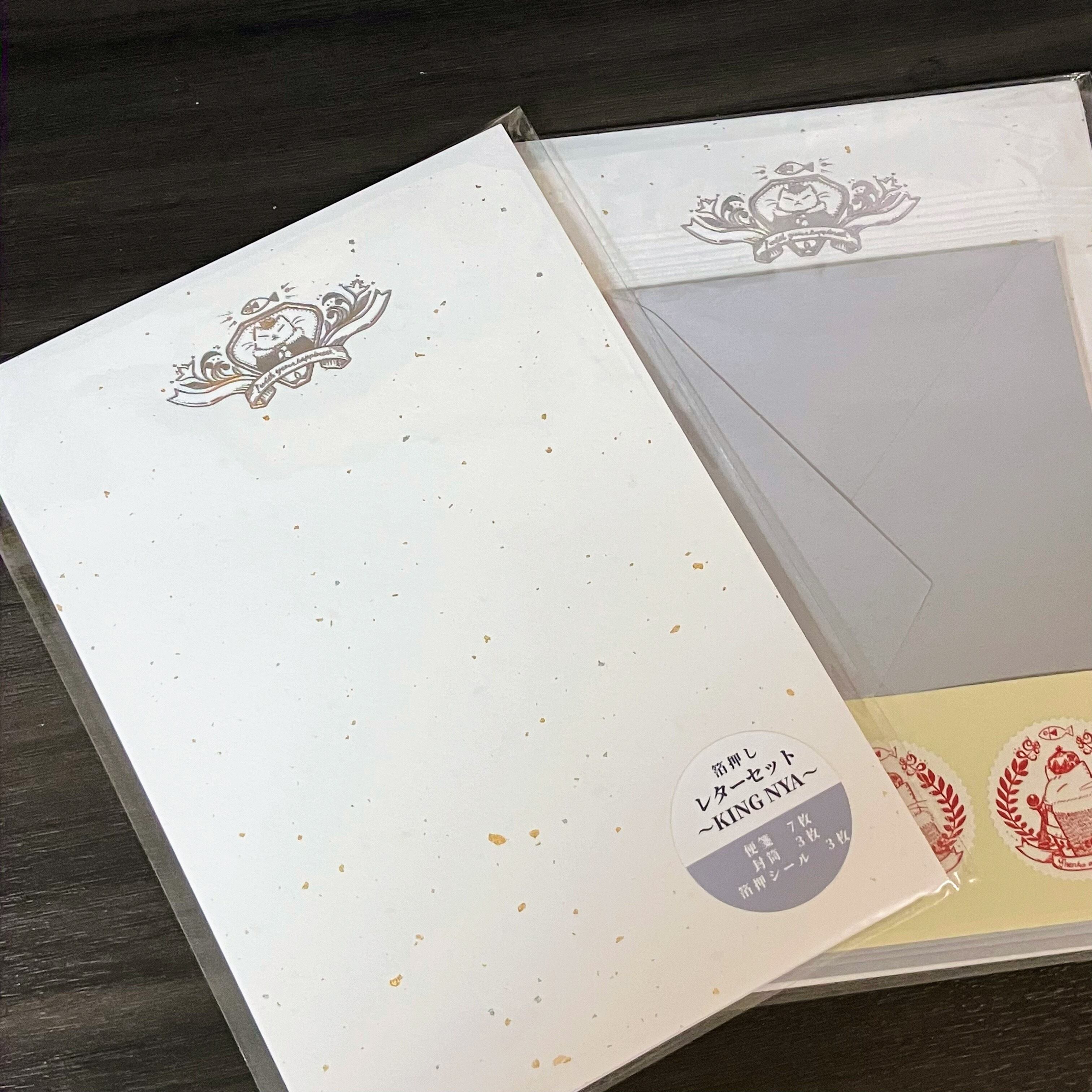 ホログラム箔の箔押し加工のあるレターセット。 角度により光り方が変わります。 箔便箋 7枚 箔押しシール(KING NYA横顔) 3枚 封筒 3枚